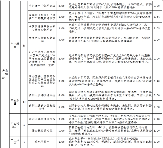 2021年度干部教育培訓(xùn)經(jīng)費(fèi)及會(huì)務(wù)經(jīng)費(fèi)項(xiàng)目采用目標(biāo)管理評(píng)價(jià)法,對(duì)績(jī)效評(píng)價(jià)指標(biāo)體系進(jìn)行綜合評(píng)分,從定性和定量?jī)煞矫鎸?duì)項(xiàng)目實(shí)施進(jìn)行績(jī)效評(píng)價(jià)。