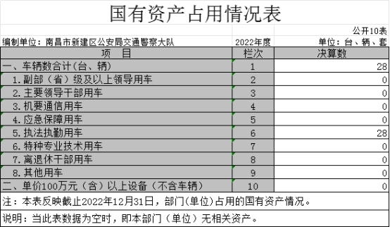 截止2022年12月31日,本部門(單位)國有資產占用情況見草案10表《國有資產占用情況表》。其中車輛中的其他用車主要是28輛,主要是執法執勤車輛。