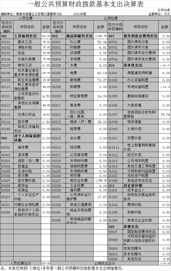本部門2022年度支出總計3954.16萬元,其中本年支出合計3954.16萬元,較2021年減少1208.07萬元,下降23.4%,主要原因是:本單位只有8名在職工勤人員,其他在職民警工資、福利由南昌市公安局交通管理局發放;年末結轉和結余0萬元,較2021年增加0萬元,增長0%。