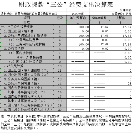 (三)公務用車購置及運行維護費支出17.67萬元,其中公務用車購置年初預算數為0萬元,決算數為0萬元,完成預算的0%,決算數較2021年增加00萬元,增長0 %,主要原因是:未購置公務車輛,全年購置公務用車0輛。決算數較年初預算數增加的主要原因是:未購置公務車輛;公務用車運行維護費支出年初預算數為100萬元,決算數為17.67萬元,完成預算的17.67%,決算數較2021年減少41.15萬元,下降69.96%,主要原因是:因劃歸南昌市公安局交通管理局的原因,車輛燃油費用由南昌市公安局交通管理局保障,年末公務用車保有28輛。決算數較年初預算數減少的主要原因是:因劃歸南昌市公安局交通管理局的原因,車輛燃油費用由南昌市公安局交通管理局保障。