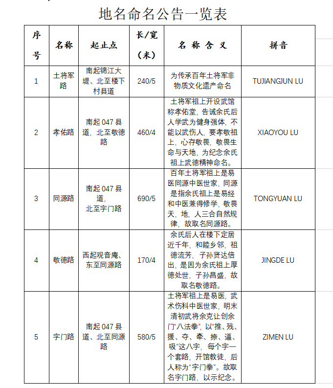 根據(jù)國務(wù)院《地名管理條例》和《江西省地名管理辦法》的規(guī)定,新建區(qū)松湖鎮(zhèn)人民政府批準了仙亭村樓下自然村土將軍路、孝佑路、同源路、敬德路、字門路等5條道路命名,依據(jù)《地名管理條例》第十四條和《地名備案公告管理辦法(試行)》第十二條規(guī)定向社會進行公告,準予使用。