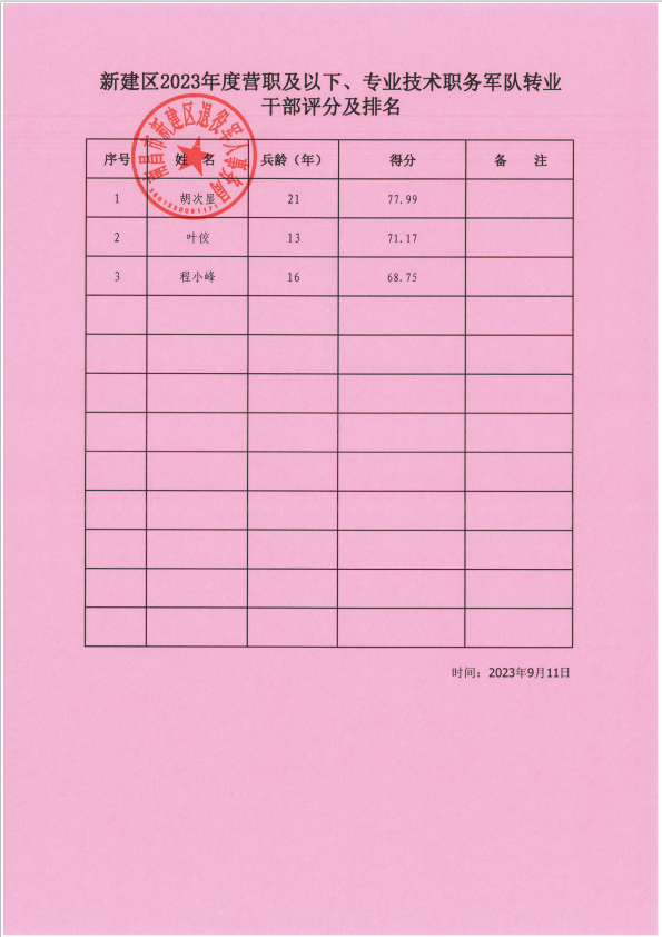 關于新建區2023年度營職及以下、專業技術職務軍隊轉業干部評分及排名的公示