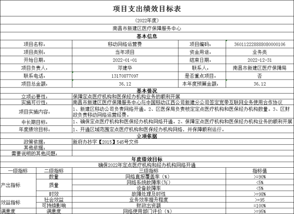 7)績效目標和指標:目標:開通區(qū)域范圍定點醫(yī)療機構(gòu)和醫(yī)保經(jīng)辦機構(gòu)網(wǎng)絡,并保障順利運行。指標:1、網(wǎng)絡直報覆蓋率(%)、2、網(wǎng)絡系統(tǒng)故障率(%)、3、設備故障率、4、故障處理及時性、5、業(yè)務效率提升程度、6、財政出資額、7、網(wǎng)絡使用部門評價(%)。