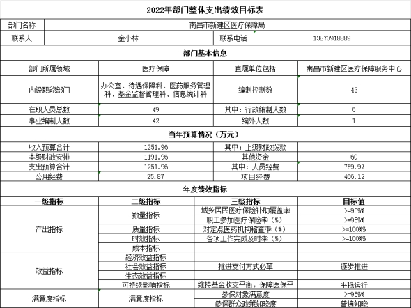 7)績效目標和指標:目標:有效提升綜合監(jiān)管、宣傳引導、經(jīng)辦服務等醫(yī)療保障能力。指標:1、基本醫(yī)保參保率、2、定點醫(yī)藥機構(gòu)監(jiān)督檢查覆蓋率、3、醫(yī)保經(jīng)辦服務能力、4、醫(yī)保綜合監(jiān)管能力、5、醫(yī)保宣傳能力、6、醫(yī)保系統(tǒng)運行維護響應時間、7、醫(yī)保重要政策知曉率、8、參保人員對醫(yī)保服務的滿意度