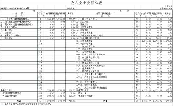 本部門2021年度收入總計1373.28萬元,其中年初結轉和結余133.7萬元,較2020年增加34.61萬元,增長34.93%;本年收入合計1239.57萬元,較2020年增加22.54萬元,增長1.85 %,主要原因是:增人增資。