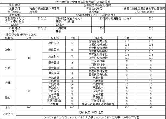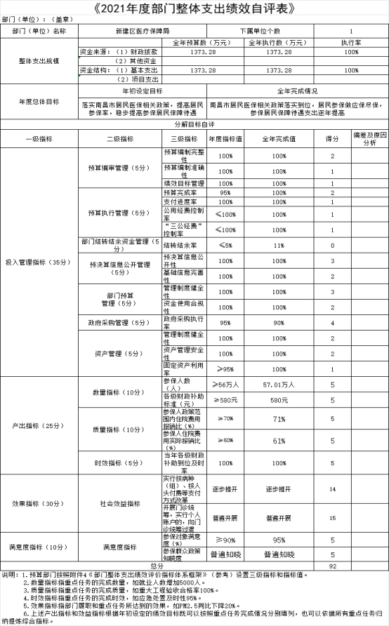 組織對“新建區醫療保障局”等 1 個部門開展整體支出績效評價試點,涉及一般公共預算支出1373.28萬元,政府性基金預算支出0萬元。從評價情況來看,新建區醫療保障局2021年整體支出績效評價得分為92分,評價等級為優,但在日常核算及專項資金管理過程中存在一些問題,如預算編制不夠完整細化,支出績效尚需規范提高。