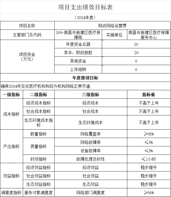 7)績效目標和指標:目標:確保2024年定點醫(yī)療機構和經(jīng)辦機構網(wǎng)絡正常開通。指標:1、網(wǎng)絡直覆蓋率(%)、2、網(wǎng)絡故障率(%)、3、設備故障率、4、故障處理及時性、5、業(yè)務效率提升程度、6、財政出資額、7、網(wǎng)絡使用部門評價(%)。