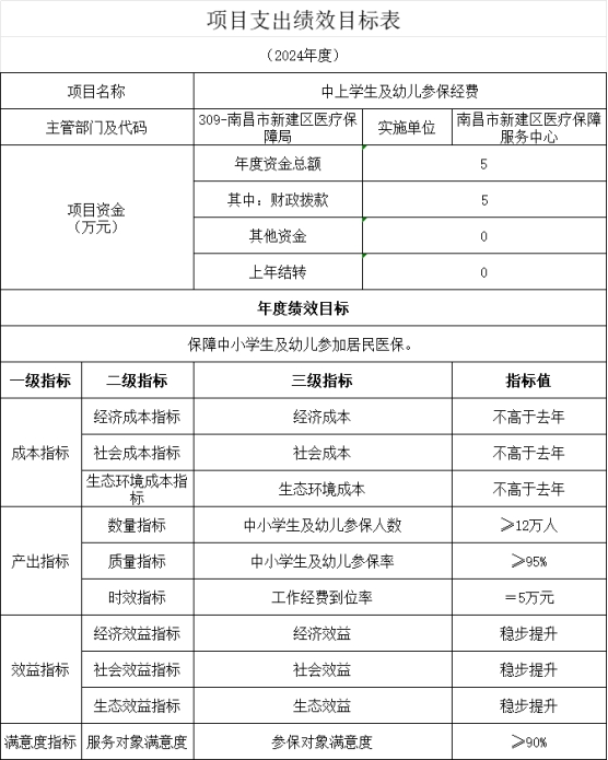 7)績效目標和指標:目標:保障中小學生及幼兒參加居民醫(yī)保。指標:1、提高中小學生及幼兒的參保人數(shù)、2、中小學生及幼兒的參保率、3、工作經(jīng)費到位率、4、參保人員對醫(yī)保服務的滿意度