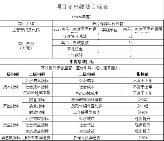7)績效目標和指標:目標:有效提升綜合監督、宣傳引導、經辦服務能力。指標:1、醫保政策培訓宣傳次數、2、反欺詐騙保查處數、3、工作經費到位率、4、參保人員滿意度。