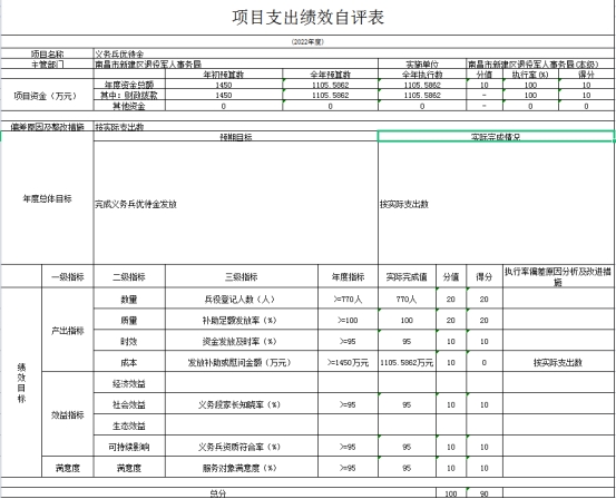 組織對(duì)“義務(wù)兵優(yōu)待金”、“優(yōu)撫對(duì)象定期補(bǔ)助”等 18 個(gè)項(xiàng)目開展了部門評(píng)價(jià),涉及一般公共預(yù)算支出 4833.73 萬元,從評(píng)價(jià)情況來看,我局全面正確行使職能,各項(xiàng)工作實(shí)現(xiàn)平穩(wěn)發(fā)展,取得了較好的社會(huì)效益,各類優(yōu)撫對(duì)象、退役士兵對(duì)我局工作的滿意度大于90%。