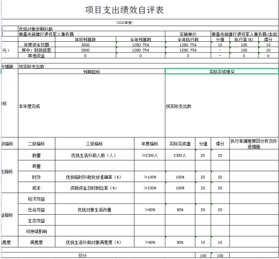 2022年度本部門共自評(píng)18個(gè)項(xiàng)目績效,其中:“兩不靠”軍轉(zhuǎn)干部待遇調(diào)整、零散烈士紀(jì)念設(shè)施維修改造兩個(gè)項(xiàng)目未在本年度實(shí)施外,其余16個(gè)項(xiàng)目整體運(yùn)行良好,各項(xiàng)指標(biāo)均已按年初目標(biāo)完成。