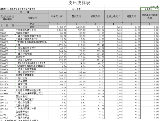 本部門2021年度支出總計 2453.27 萬元,其中本年支出合計 2453.27 萬元,較2020年減少 1070.50 萬元,下降30.38 %,主要原因是:2020年退役士兵一次性社保接續工作已基本完成。年末結轉和結余 0萬元,較2020年減少662.62萬元,下降100%。
