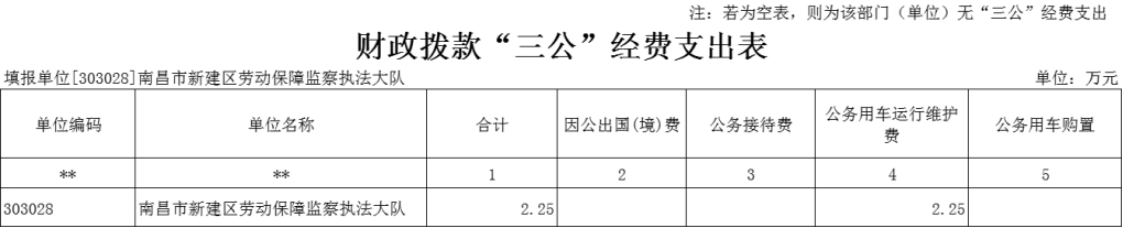 2024年南昌市新建區(qū)勞動保障監(jiān)察執(zhí)法大隊單位為"三公"經(jīng)費財政撥款安排 2.25 萬元,其中: