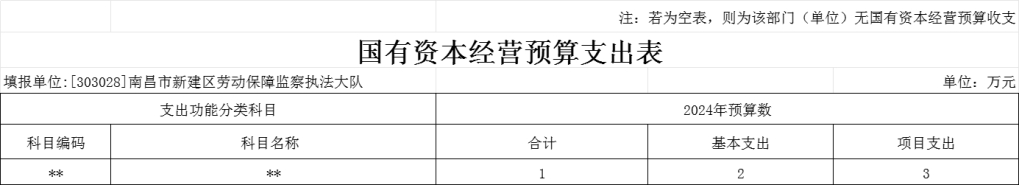 2024年南昌市新建區(qū)勞動保障監(jiān)察執(zhí)法大隊單位國有資本經(jīng)營收入預算為 0 萬元,支出預算為 0 萬元,其中:基本支出 0 萬元,項目支出 0 萬元。
