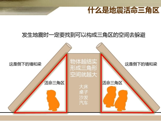 ●地震時較為安全的地方是避震三角區,倒下的墻和梁和大床、桌子、沙發、汽車等堅固物體形成避震三角區,物體越結實形成三角形空間就越大。