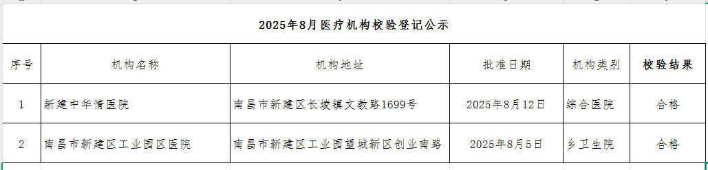 2025年8月醫療機構校驗登記公示